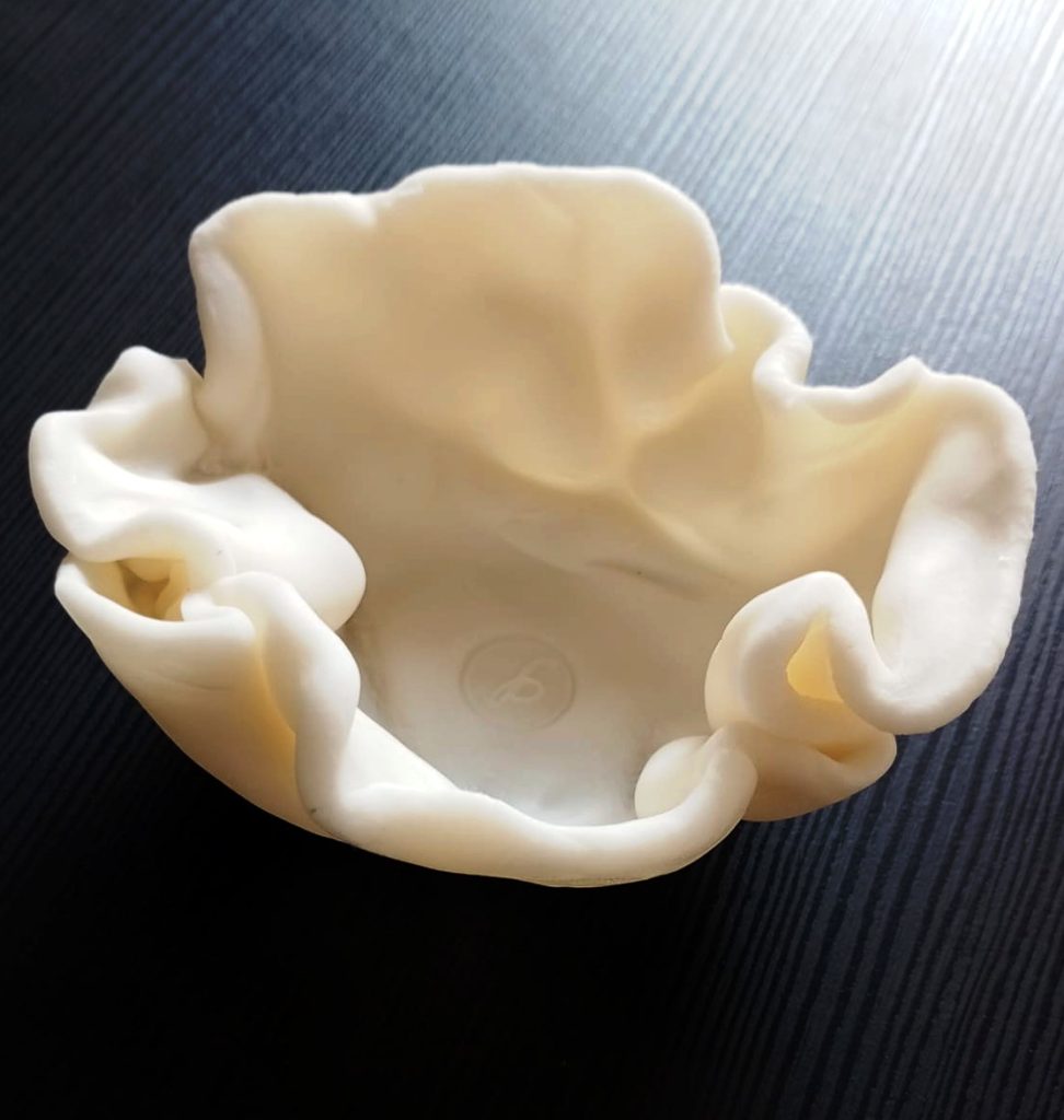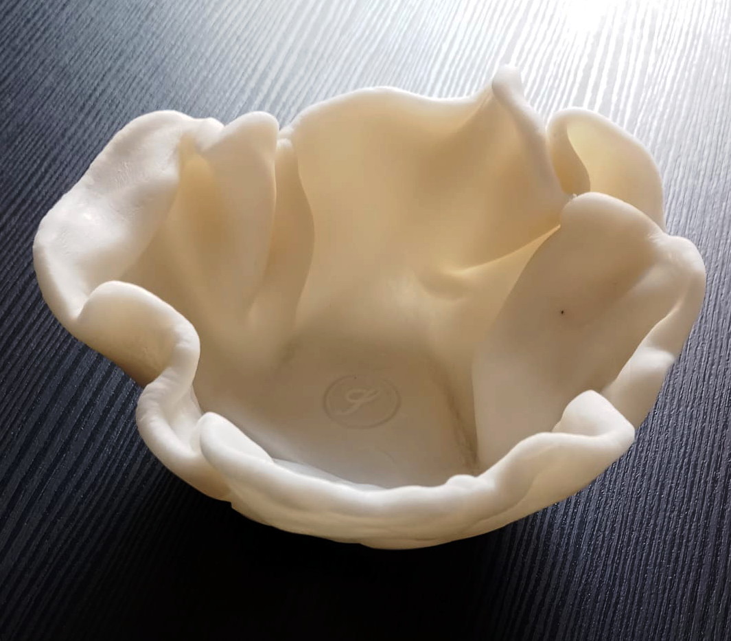 Graziosa e minuta ciotolina a forma di cartoccio, in porcellana fredda, interamente modellata e dipinta a mano.