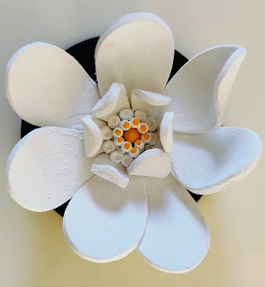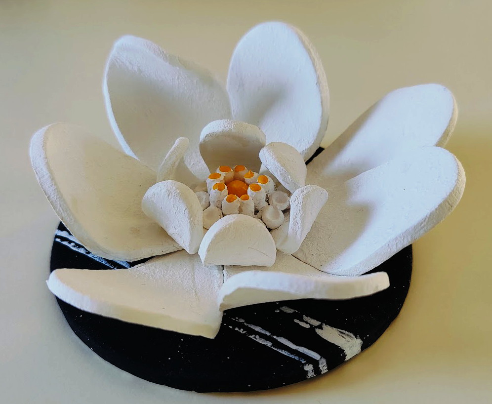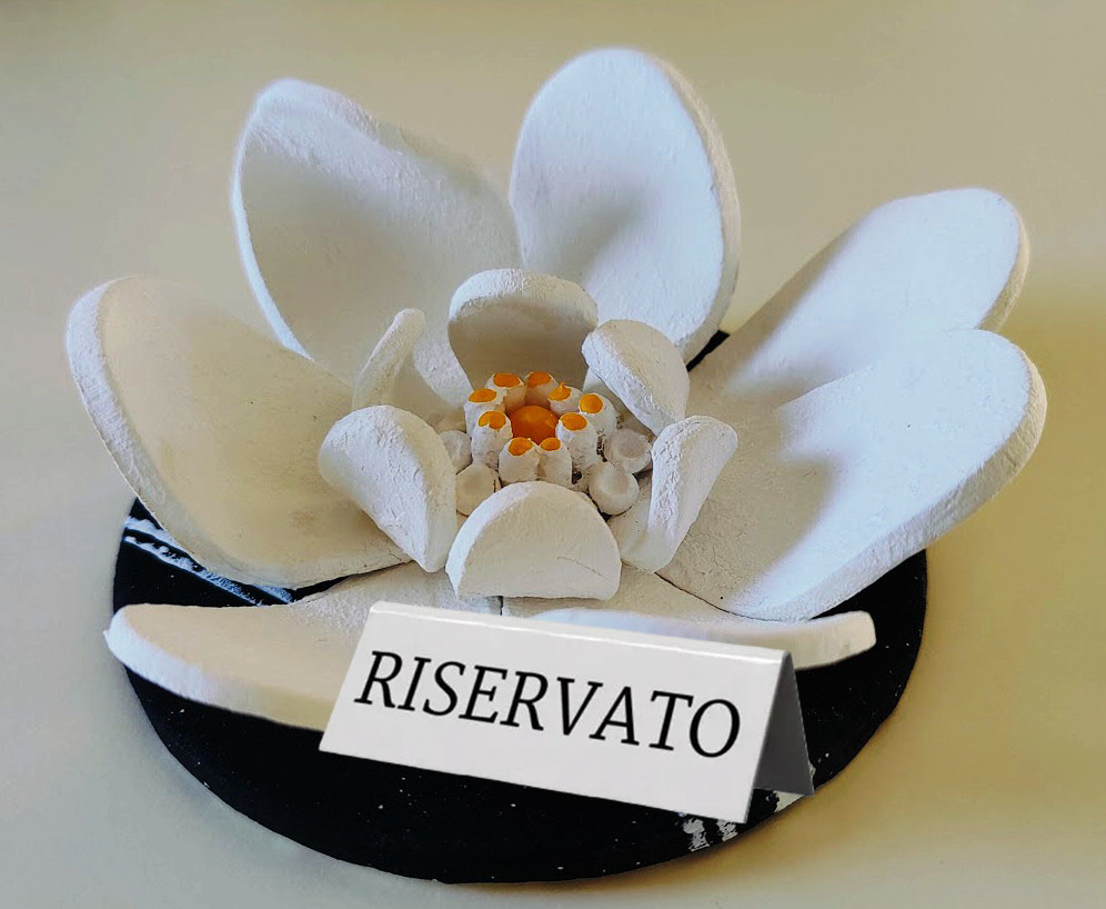 Creazione in ceramica fredda, Fiore di magnolia su base rotonda Interamente modellato e dipinto a mano. Piccolo e discreto soprammobile ben si adatta a qualsiasi tipo di arredamento.