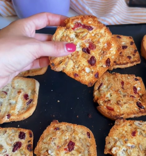 Montate gli albumi e fateli schiumare un pochino, aggiungete lo zucchero e montate fino ad ottenere una sorta di meringa. Setacciate la farina e incorporatela. Infine inserite la frutta secca e la frutta disidratata. Mescolate e versate in uno stampo da plum-cake piccolo da 19 cm foderato con carta forno. Infornate a 175 gradi per circa 30 minuti. Lasciate freddare e tagliate le fette. Posizionatele sulla teglia e tostatele in forno a 200 gradi per 2/3 minuti, da un lato e poi dall’altro.