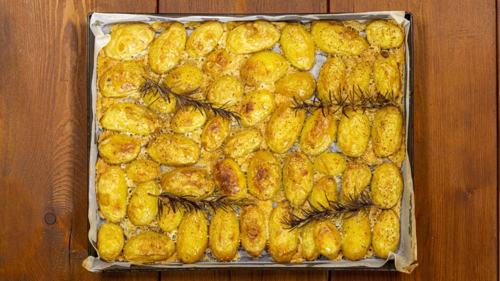 Per realizzare la ricetta delle patate croccanti al parmigiano, occorreranno delle patate novelle di piccole dimensioni. Tagliate le patate a metà per il senso della lunghezza senza rimuovere la buccia, quindi mettetele in pentola con acqua fredda, portate a bollore, salate e lessatele per circa 10 minuti dal momento del bollore. Al termine della cottura le patate dovranno risultare tenere ma ancora integre. Scolate le patate e lasciatele raffreddare, trasferitele in un recipiente e conditele con un generoso giro di olio EVO, mescolate bene in modo che ne siano ricoperte in modo uniforme. Distribuite il parmigiano grattugiato su una teglia rivestita con carta forno facendo in modo da ottenere uno strato omogeneo, poggiate sopra le patate preparate con la buccia rivolta verso l’alto, salate leggermente e insaporite con un pizzico di pepe macinato. Aggiungete qualche rametto di rosmarino e trasferite in forno preriscaldato in modalità grill a massima potenza, lasciate cuocere per 15-20 minuti o fino a completa grattinatura.
