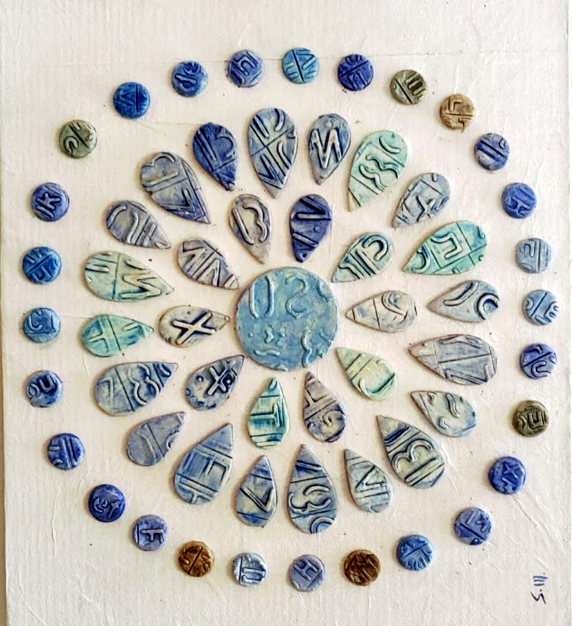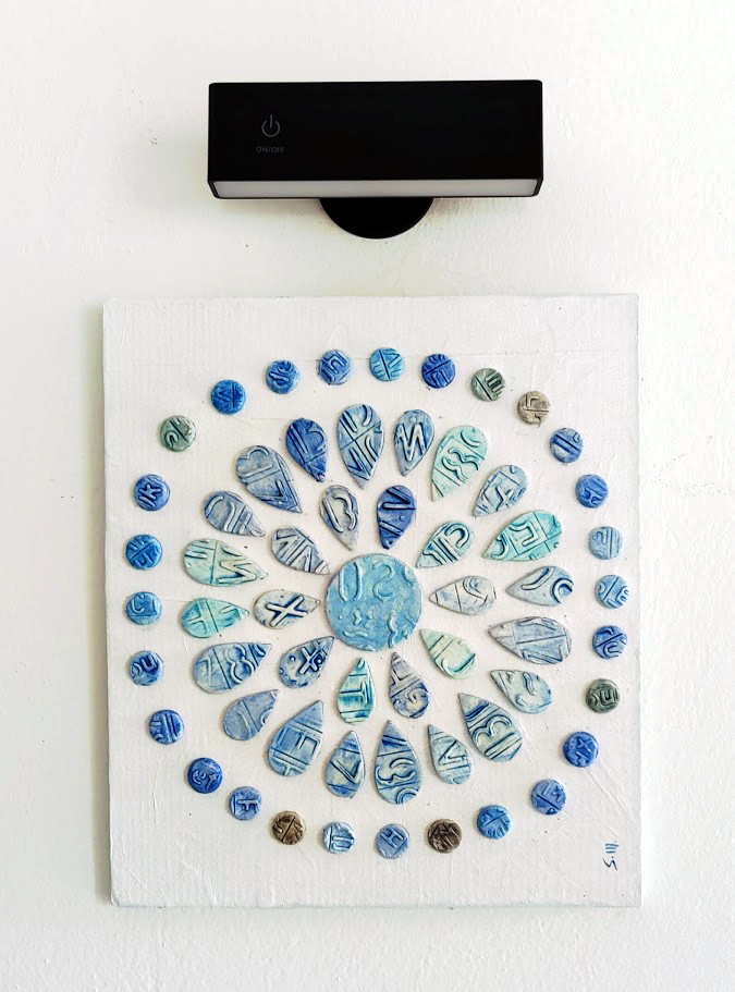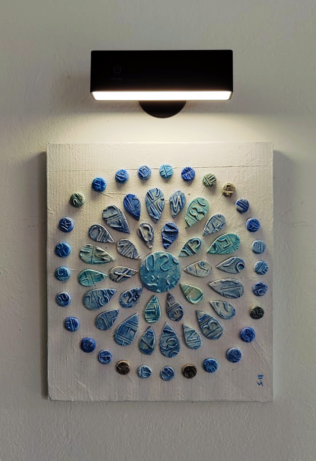 Mandala per l’amica Silvia. Fondo bianco e tasselli in ceramica fredda su tavola, con colori in tonalità prevalentemente azzurra.