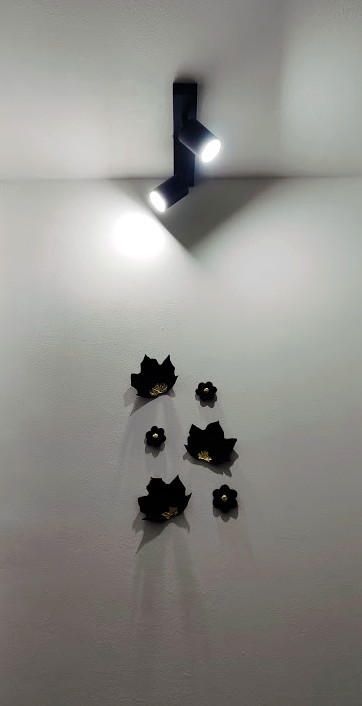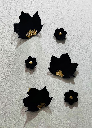 Installazione. Deliziose foglie e fiorellini interamente modellati e dipinti a mano, impreziositi con foglia oro. Attaccate al muro con il @patafix danno un tocco di originalità ad una parete vuota e anonima.