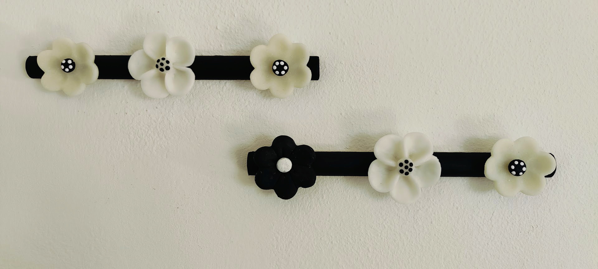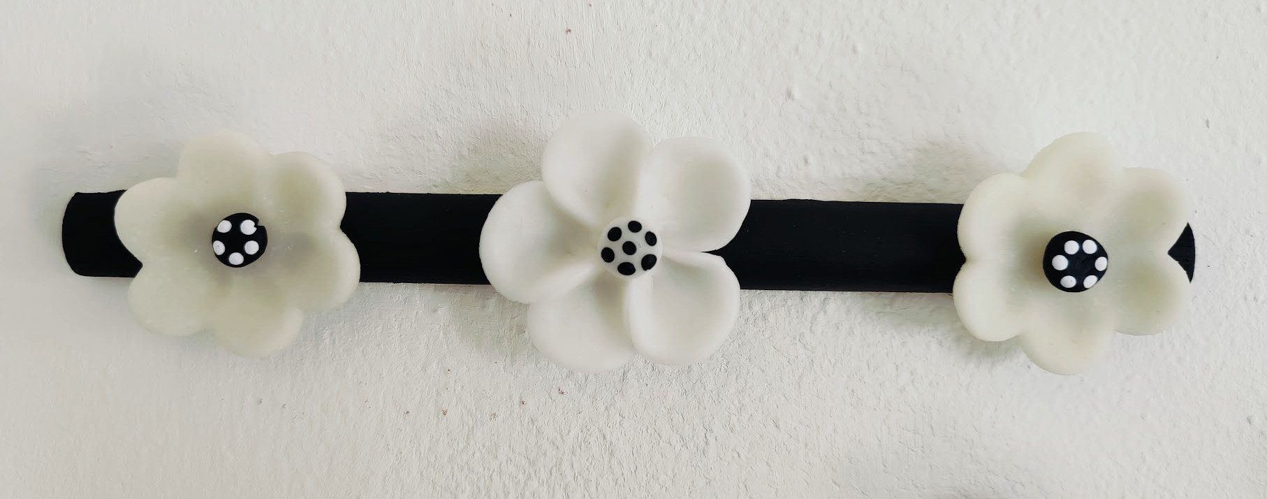 Una parete bianca, anonima. La voglia di creare qualcosa che la rendesse attuale e gradevole. Ecco fatto: Una piccola installazione fatta con una listarella in legno sulla quale ho incollato dei fiori interamente creati e modellati a mano. Poi li ho dipinti, ognuno in modo leggermente diverso. Infine li ho attaccati al muro usando il “Patafix” che è rimovibile! Ora la parete è “piena” e non sfigura.