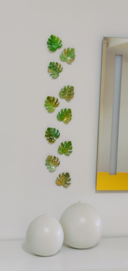 Installazione. Gruppo di foglie di palma in argilla cruda, tutte modellate e dipinte singolarmente a mano, attaccate poi al muro con il “Patafix @”. Ottimo metodo per riempire uno spazio vuoto, di sicuro effetto.
